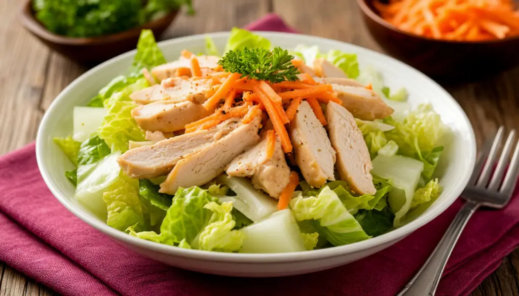 Если вам хочется чего-то нового и свежего, рекомендуем альтернативный вариант — яркий, хрустящий салат с пекинской капустой, куриным мясом и сыром. Он сохраняет сытность привычного блюда, но благодаря сочной капусте и красному луку становится более лёгким и летним. Кроме того, его приготовление занимает совсем немного времени.