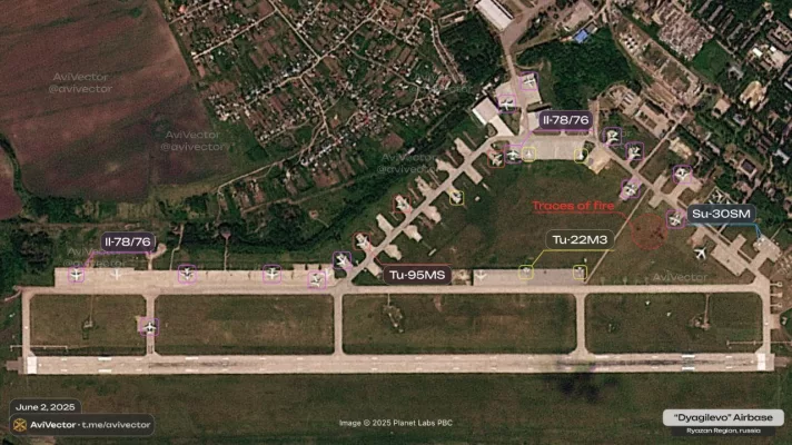 Единственно, что можно заметить, это следы возгорания на траве в правой части снимка. Вероятно, туда упали обломки сбитого или подавленного дрона.