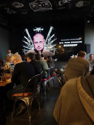 «Было под 100 человек. Одна за столиком сидела некая Настя, говорит: «я художница, хотела делать героику СВО, но это непросто. Поэтому я сделала ваш бюст пока только. Он в гардеробе. Идет туда, берет большую коробку, отдает ему, там что-то позолоченное». Он шутит — мол, надеюсь вы не сделали меня толстым. Говорит спасибо, ставит рядом. Она садится на свое место, проходит минуты три. Взрыв, хлопок, пламя, все бегут. «Настя», казалось, не ушла заранее.»