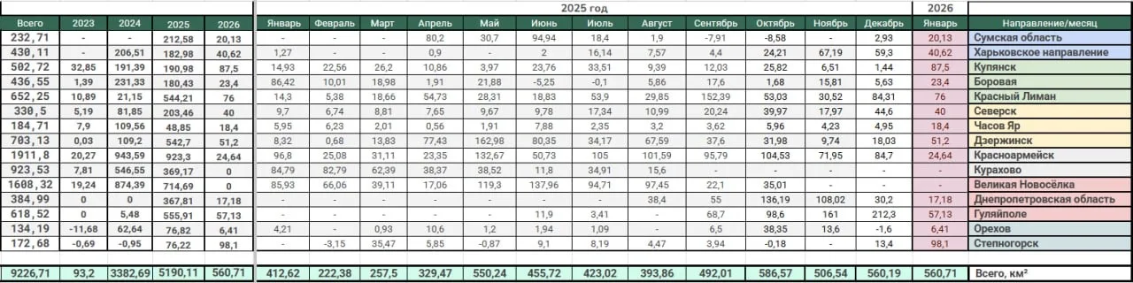 Площадь контролируемая ВС РФ в зоне проведения СВО в январе 2026 увеличилась на 560,71 км² с темпом продвижения +18,09 км² в среднем за сутки.