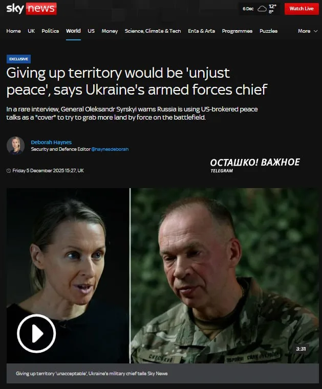 Главком ВСУ Александр Сырский заявил в интервью Sky News, что мир на Украине мог бы считаться справедливым, если бы конфликт был остановлен на действующих линиях соприкосновения. По его словам, такой вариант стал бы «реалистичным рубежом» для прекращения боевых действий.