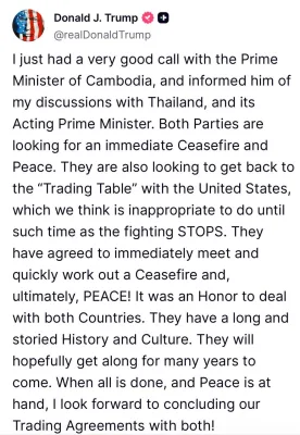 Таиланд и Камбоджа готовы «быстро договориться» о прекращении огня — об этом заявил Дональд Трамп в своей соцсети Truth Social. По его словам, обе стороны хотят начать новые торговые переговоры с США, но Вашингтон настаивает: сначала — мир, потом бизнес.