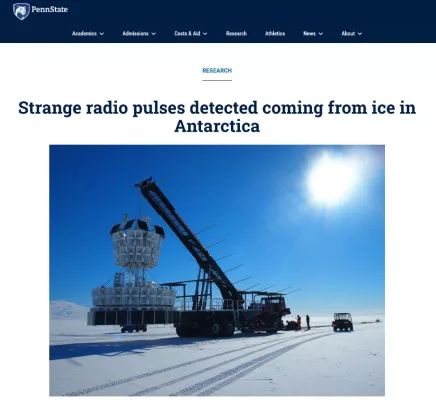На высоте 40 км над Антарктидой ANITA — воздушная антенна на шарах, предназначенная для улавливания космических частиц, зафиксировала радиосигналы, идущие под углом 30° из-под поверхности льда.