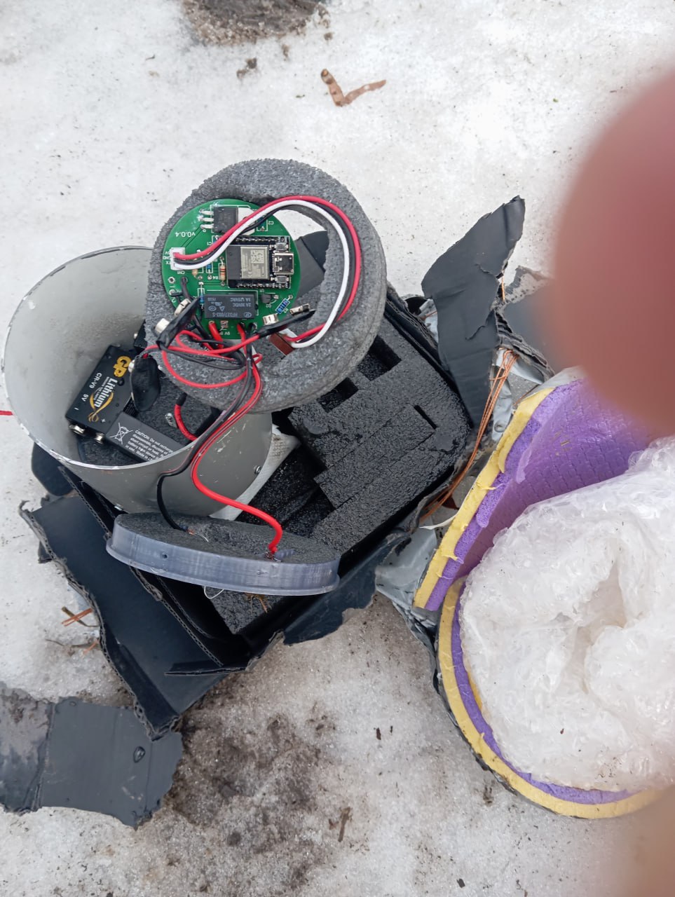 Запускается в сторону РФ, внутри — платка на ESP с GPS приёмником на проводке, которая постоянно мониторит координаты изделия. В контроллер прошиты координаты наших городов. Если изделие оказывается над любым таким городом, оно сбрасывает бабаху вниз.
