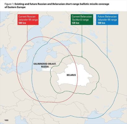На карте радиус ядерного искандера от крайних точек в Калинингардской области и в Беларуси.