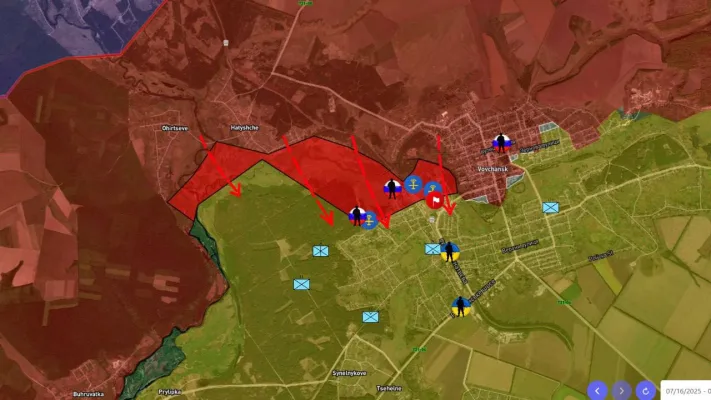 ВСУ бросили часть позиций южнее реки Волчья, в результате чего российские подразделения смогли продвинуться более чем на километр и закрепиться в новых точках на городской застройке и её промышленных окраинах.