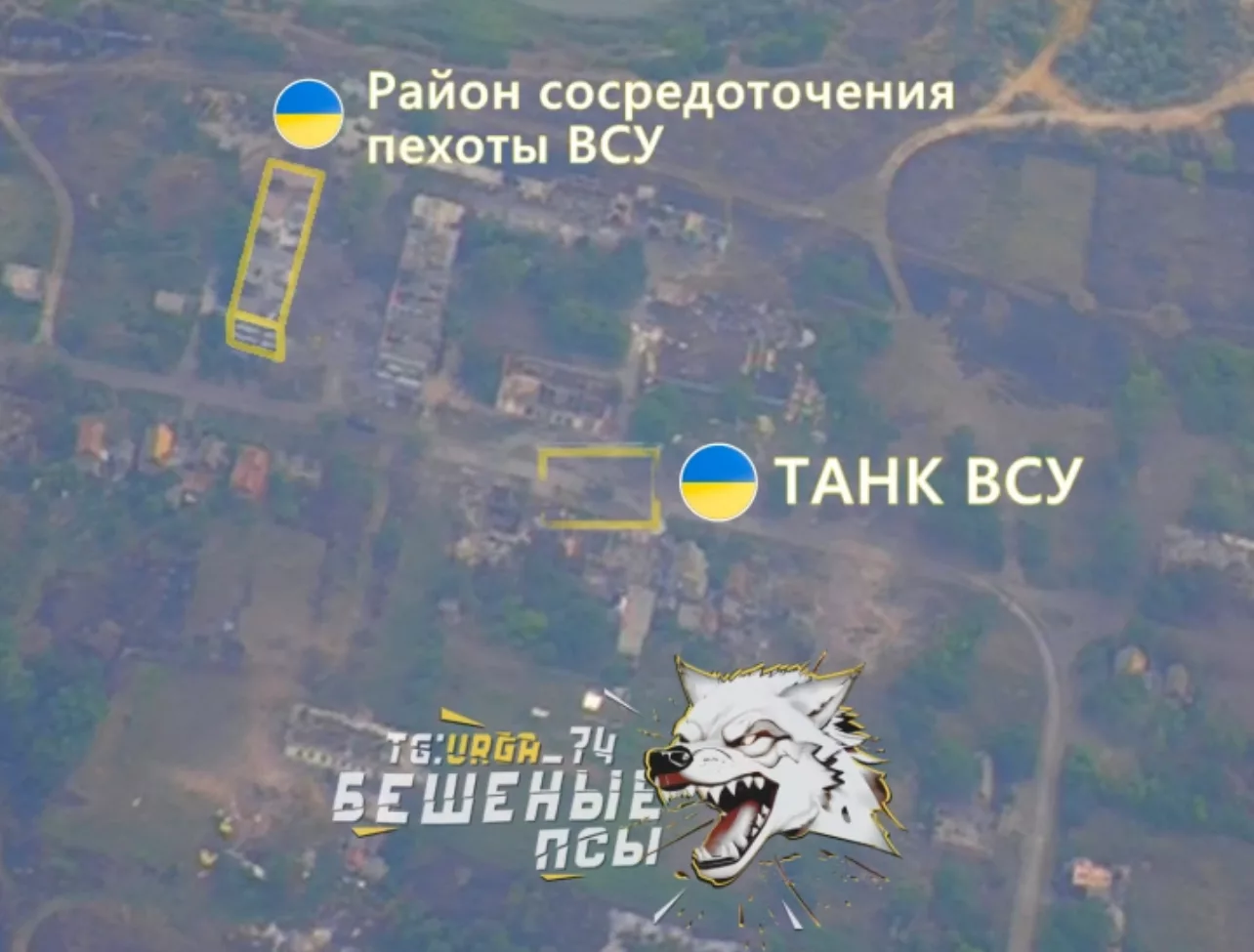 По предварительной информации, из дома в котором укрывалась пехота ВСУ, был открыт огонь по своему же танку.