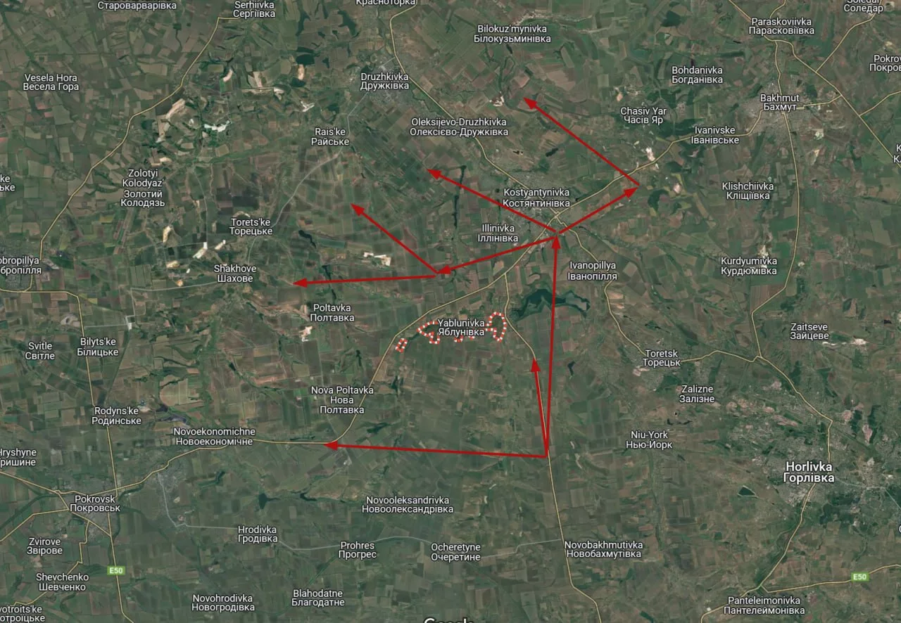 Удар на Покровск — по левому краю, давление на Константиновку — в центре, и вполне вероятная возможность поднажать, чтобы посыпалось — в районе Часова Яра. При удачном стечении обстоятельств это создаёт условия для оперативного охвата, перегиба логистики и вынужденного отхода значительной части украинской группировки на этом участке.