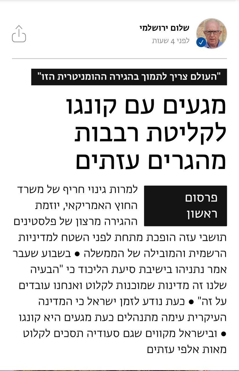 «Конго будет готово принять мигрантов, и мы ведем переговоры с другими», — цитирует новостной сайт высокопоставленного источника в кабинете безопасности Израиля.