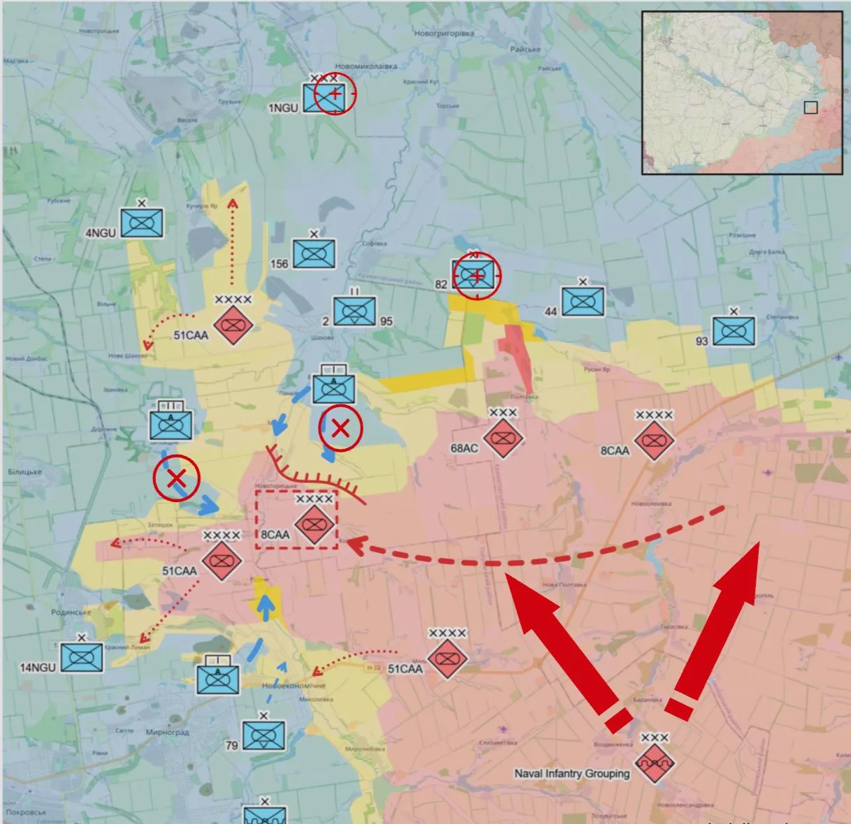 На практике это значит, что трюк с ударом на север от Покровска удался и Сырский на эту приманку клюнул. РФ сознательно и на протяжение относительно длительного времени создавали локальный прорыв, который превратился в сильный раздражитель не только для ВСУ, но и для Киева в целом. Нужно это было, чтобы сначала притянуть, и затем зафиксировать в этом секторе лучшие подразделения противника (он бросает туда резервы, смены, элиту, которые не расползаются по фронту), а затем всеми средствами или средствами смежных сил (в данном случае силами 8-й армии) «добивает»/уничтожает их. В жёсткую позиционку боевые действия здесь ещё не переросли, и линия фронта может меняться плюс-минус каждый день, но в целом можно сказать, что план оказался рабочим. А куда он выведет — станет понятно к исходу осенней кампании.