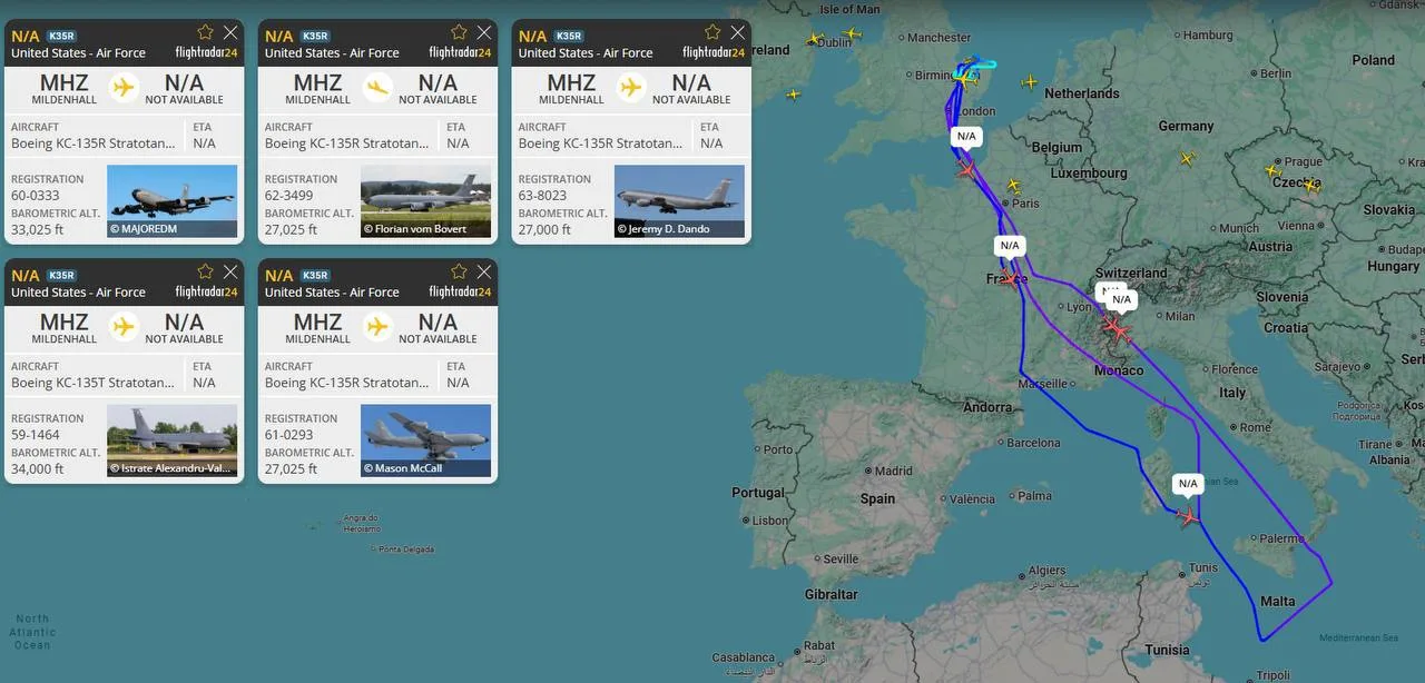 С авиабазы Королевских ВВС в Милденхолле поднялись как минимум пять заправщиков KC-135R/T, взяв курс на юг Европы. Их задействовали для обеспечения перелёта звена из шести F-35A Lightning II, принадлежащих эскадрилье The Green Mountain Boys (158-е истребительное крыло Национальной гвардии штата Вермонт), которые перебрасываются с британской авиабазы Лейкенхит на конечный пункт дислокации — иорданскую авиабазу Муваффак Салти.