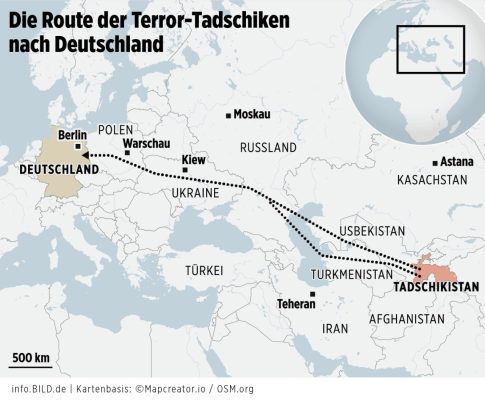Война на Украине упростила въезд в ФРГ для террористов из Таджикистана, так как они могут выдавать себя за беженцев. У них часто фальшивые документы и вымышленные истории о пытках и преследованиях. В Германии спасающихся от войны в Украине принимают почти без проверок. Кроме того, по пути через зону боевых действий на юге и востоке Украины они легко получают бомбы, которые везут в Западную Европу. Например, гранаты или снаряды для РПГ. Для нападения с помощью этих боеголовок они готовы использовать дроны.