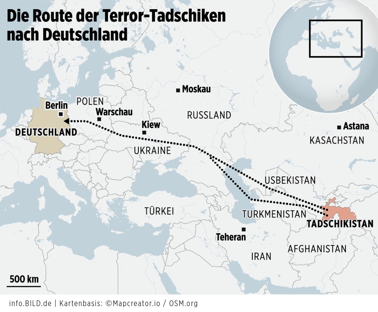 В последнее время в Германии растёт число арестованных террористов из Таджикистана. Часто они связаны с группировкой «Исламское государство в Хорасане». Это ответвление ИГИЛ, действующее на территории Пакистана, Ирана, Афганистана и Центральной Азии. В июле на западе ФРГ задержали пять граждан Таджикистана и по одному — из Туркменистана и Кыргызстана. На днях арестовали боевиков, готовивших атаку на Кёльнский собор.