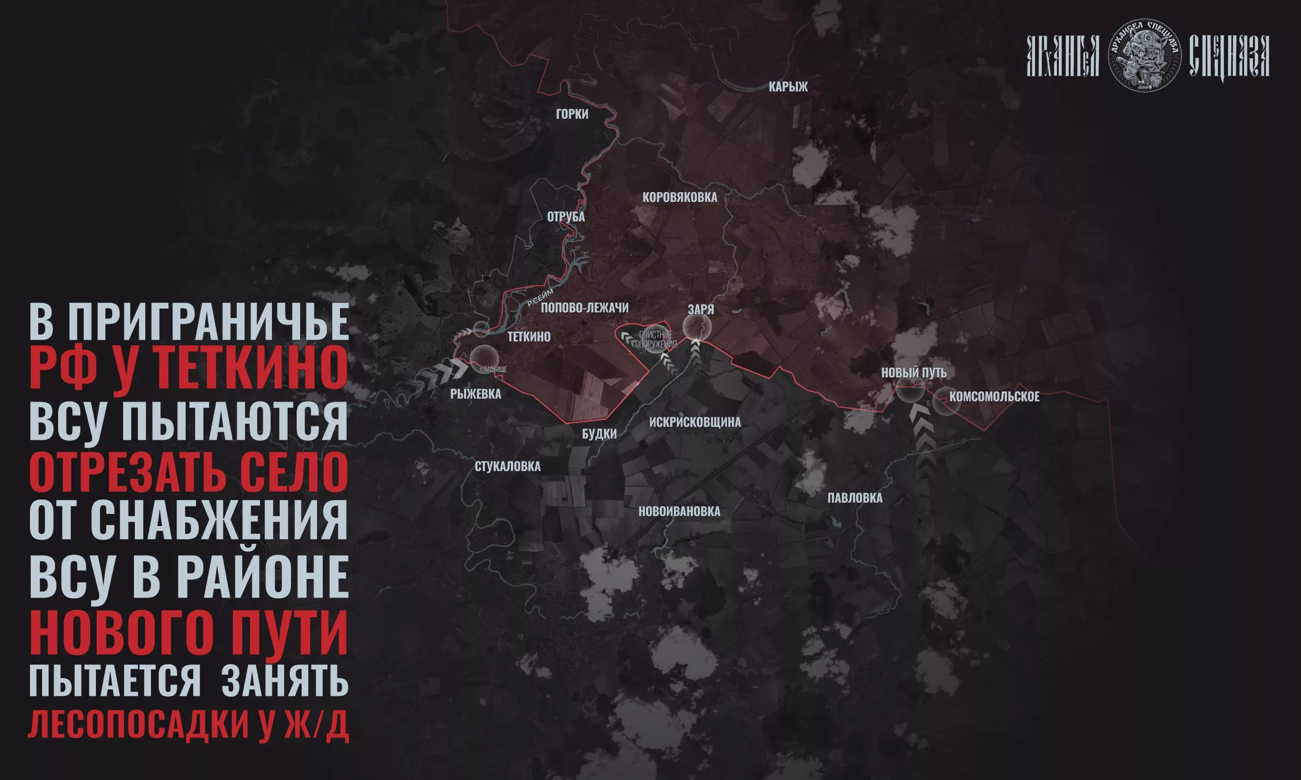 - Опираясь на кладбище, он пытается зайти в само Теткино. Также ВСУ атакуют из района очистных сооружений, где они смогли закрепиться и накопить силы. Теперь враг пытается развить успех в направлении Попово-Лежачи, чтобы отрезать группировку в Теткино.