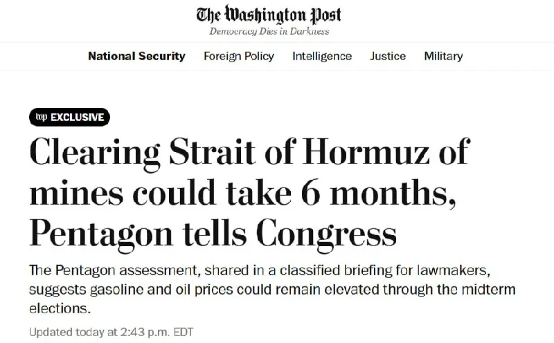«Пентагон довел до сведения Конгресса, что полностью очистить Ормузский пролив от мин, заложенных иранскими военными, может потребовать шесть месяцев работы, и любая такая операция может пройти лишь тогда, когда завершится война США и Ирана. Такая оценка ситуации означает, что экономические последствия конфликта могут ощущаться и в конце этого года и далее»
