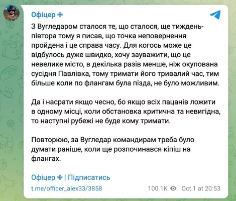 Угледар было бы сложно удерживать длительное время после того, как ВС РФ заняли фланги, пишет лейтенант ВСУ с позывным «Алекс».