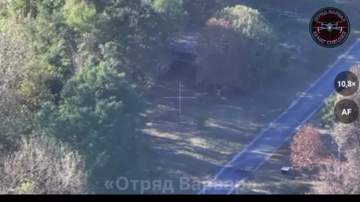 Укронацисты жаловались на то что у них проблемы с подвозом продовольствия и Б/К на Курском направлении. Обнаружили такую точку и уничтожили FPV-дроном. Внутри было топливо и поэтому одного дрона было достаточно для того чтобы уничтожить позицию