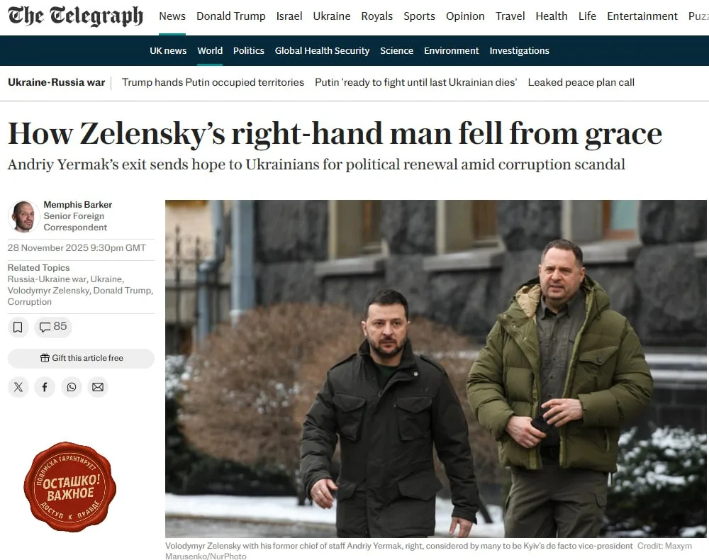 The Telegraph пишет, что обыски и последующее отстранение Андрея Ермака от должности главы офиса президента Украины были инициированы США. Издание подробно описывает его роль при Зеленском, напоминая, что они «спали в нескольких шагах друг от друга в бункере», тренировались вместе и практически не расставались на официальных мероприятиях. Критики называли Ермака «зелёным кардиналом», совмещавшим в себе функции силовика, дипломата и переговорщика.
