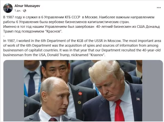 Он написал, что в 1987 году работал в 6 управлении КГБ СССР, и тогда управлением был завербован американский бизнесмен Трамп, которому дали псевдоним «Краснов».