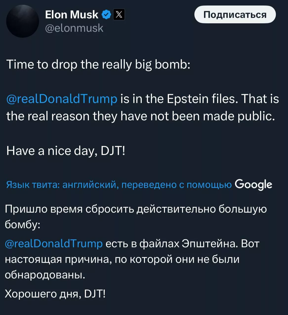 Пришло время сбросить действительно большую бомбу: Трамп есть в файлах Эпштейна. Вот настоящая причина, по которой они не были обнародованы. Хорошего дня, DJT!