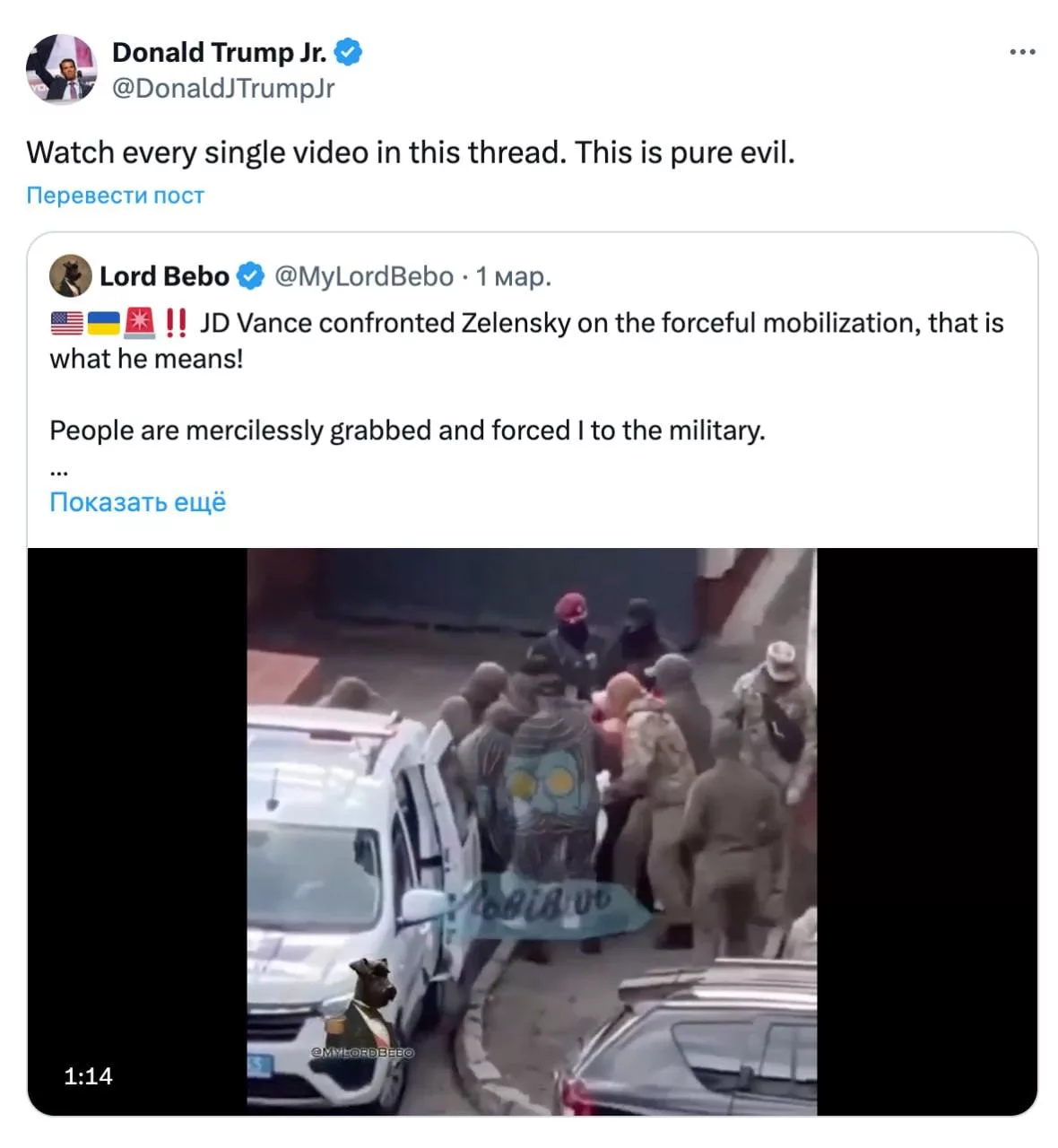 Сам Трамп-младший назвал мобилизацию на Украине «абсолютным злом».