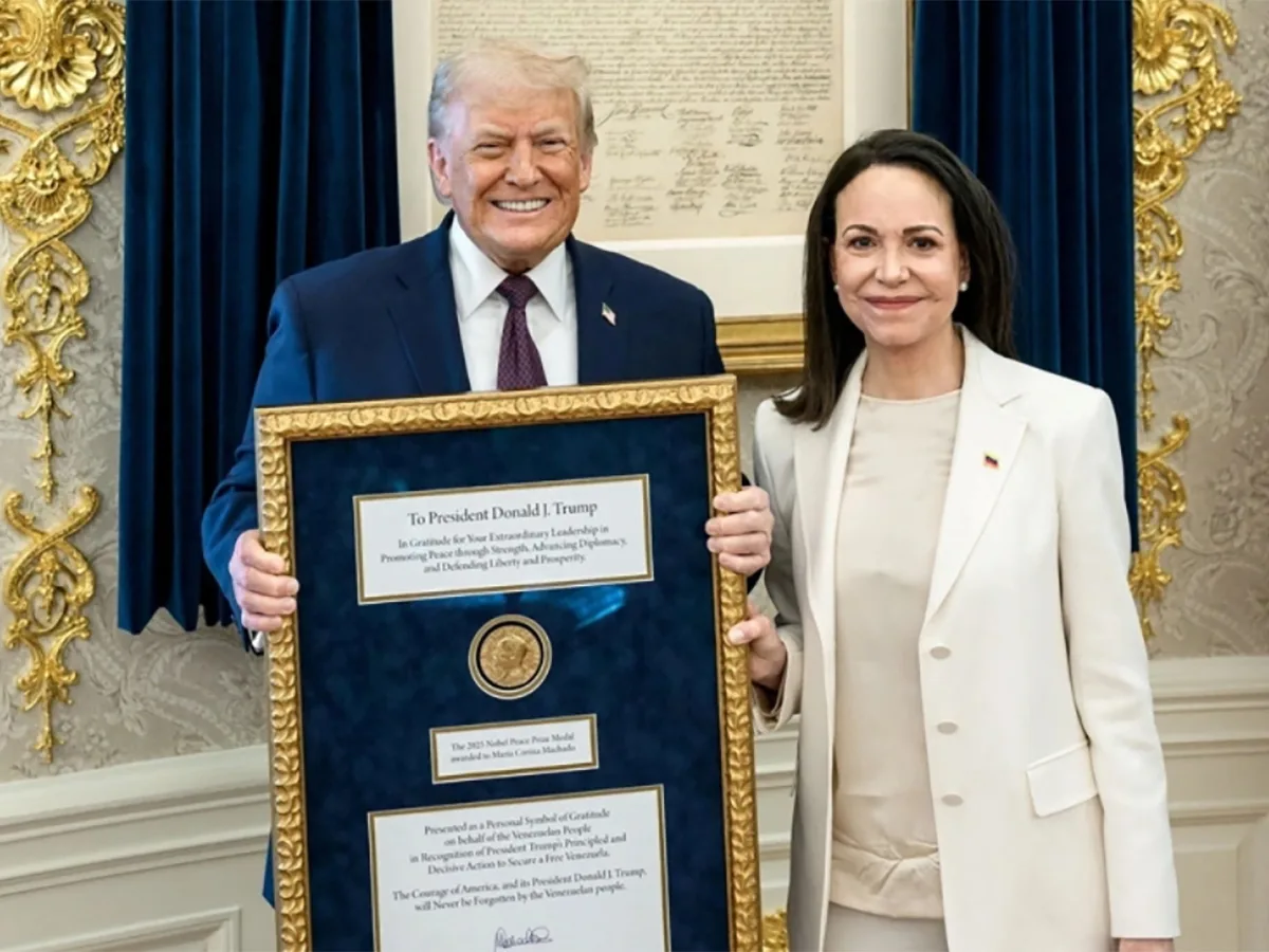 Во время своего визита в Белый дом лидер венесуэльской оппозиции Мария Корина Мачадо передала президенту США Дональду Трампу медаль Нобелевской премии мира, которую она получила в 2025 году.
