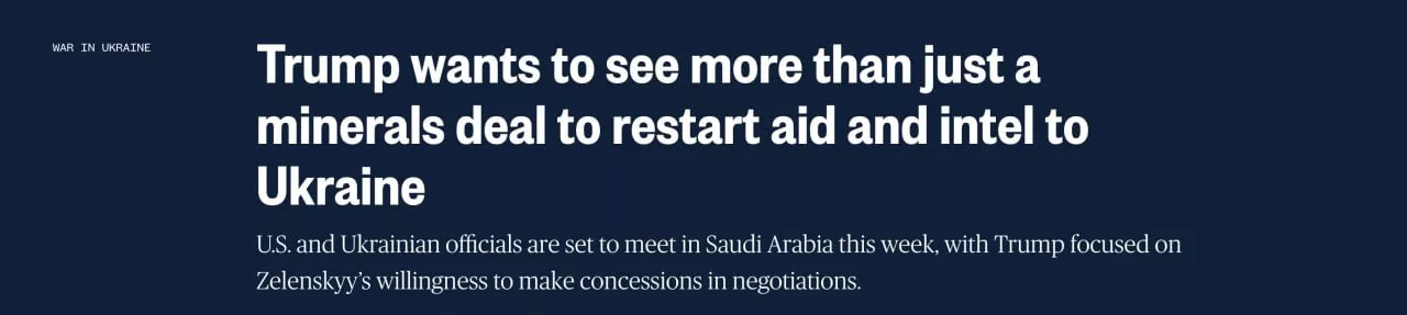 NBC News сообщает, что Дональд Трамп в приватных беседах дал понять: даже если Украина подпишет соглашение о передаче Вашингтону доступа к своим полезным ископаемым, это не станет поводом для возобновления военной помощи и передачи разведданных.