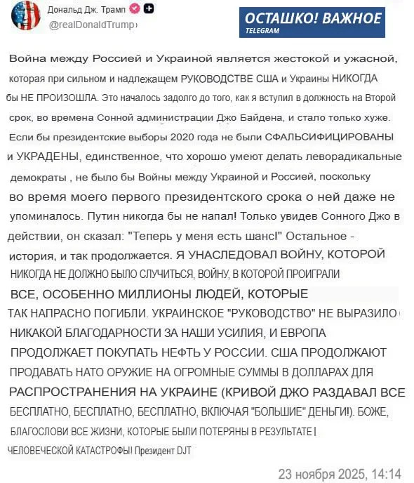 «Война между Россией и Украиной — жестокая и ужасная, и при сильном и правильном руководстве США и Украины она бы никогда не случилась. Она началась задолго до того, как я вступил в должность во второй раз, при администрации Сонного Джо Байдена, и лишь ухудшалась»,