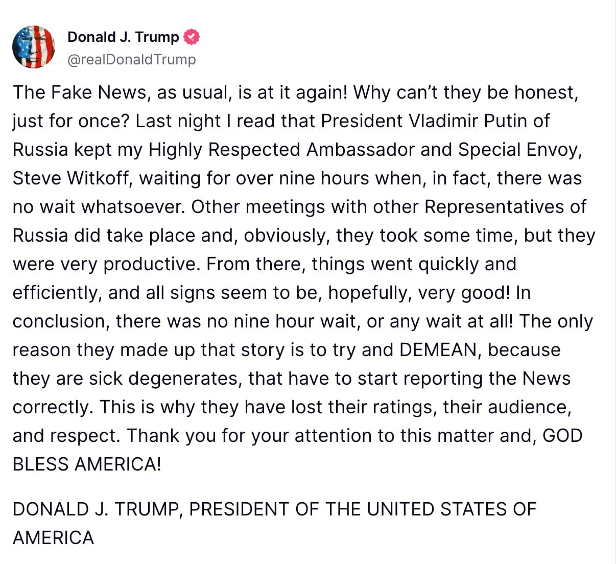 Ранее Sky News распространил информацию, что спецпосланник Трампа Уиткофф якобы более 8 часов ждал встречи с Путиным в Москве.