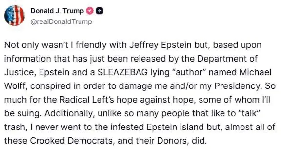 Он утверждает, что Эпштейн и журналист Майкл Вольф ранее якобы сговаривались, чтобы навредить ему и его президентству. Трамп намерен судиться с теми, кто распространяет «ложь».