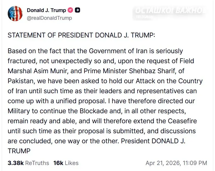 «В связи с серьёзным расколом правительства Ирана, что неудивительно, и по просьбе фельдмаршала Асима Мунира и премьер-министра Пакистана Шехбаза Шарифа, нас попросили приостановить нападение на Иран до тех пор, пока его лидеры и представители не смогут выдвинуть единое предложение»