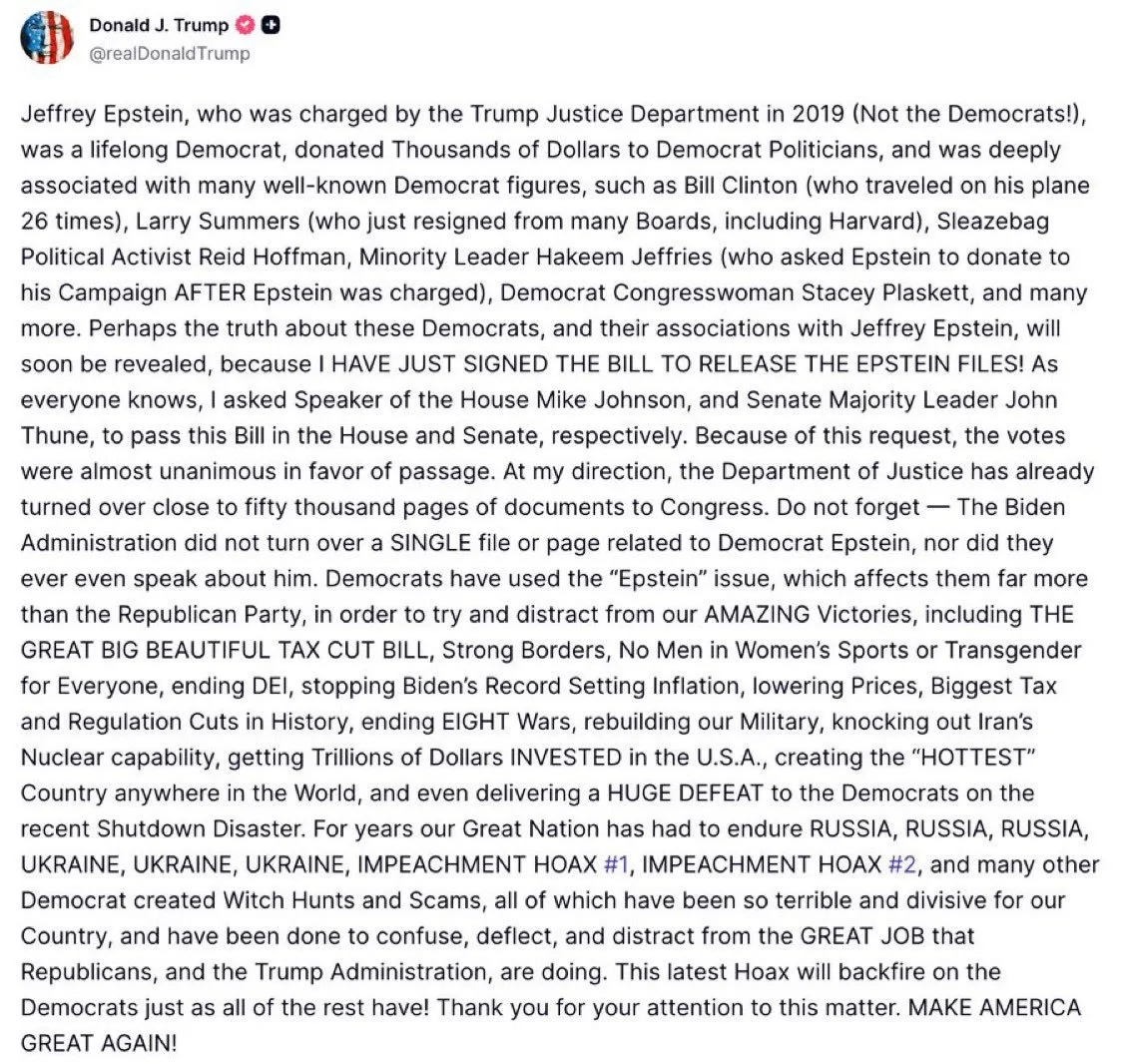 Документы касаются демократов, связанных с Эпштейном. Он обвинил команду Байдена в том, что она не передала ни одной страницы и «избегает темы».