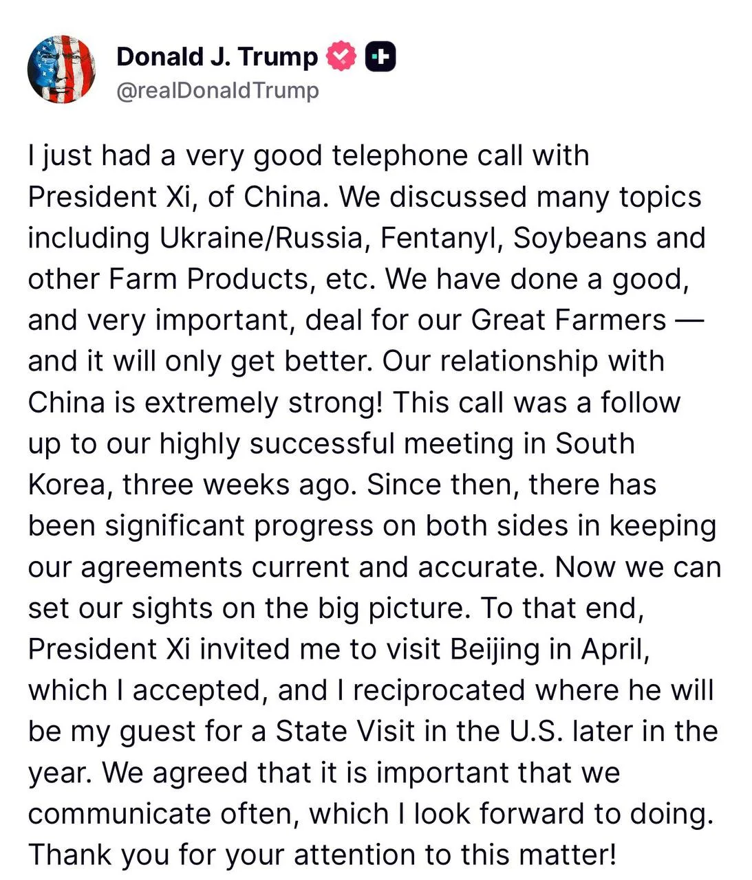 Трамп сказал, что отношения укрепились после их недавней встречи в Южной Корее, с существенным прогрессом в исполнении соглашений и подготовке к более широким сделкам. Ожидается, что Си совершит государственный визит в США в 2026 году. Трамп подчеркнул постоянное общение и назвал предстоящие переговоры критическим шагом для защиты американских интересов и достижения результатов для страны.