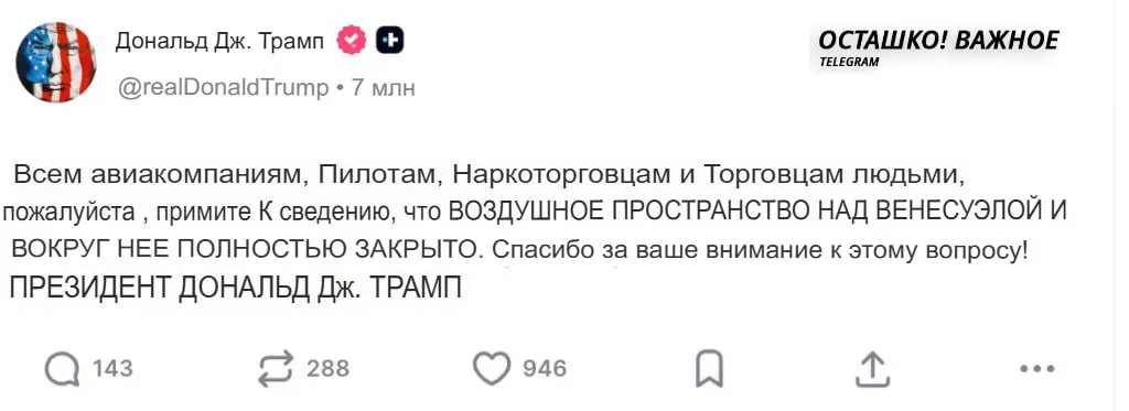 «Всем авиакомпаниям, пилотам, торговцам наркотиками и торговцам людьми, пожалуйста, примите во внимание, что ВОЗДУШНОЕ ПРОСТРАНСТВО НАД И ВОКРУГ ВЕНЕСУЭЛЫ ПОЛНОСТЬЮ ЗАКРЫТО»,