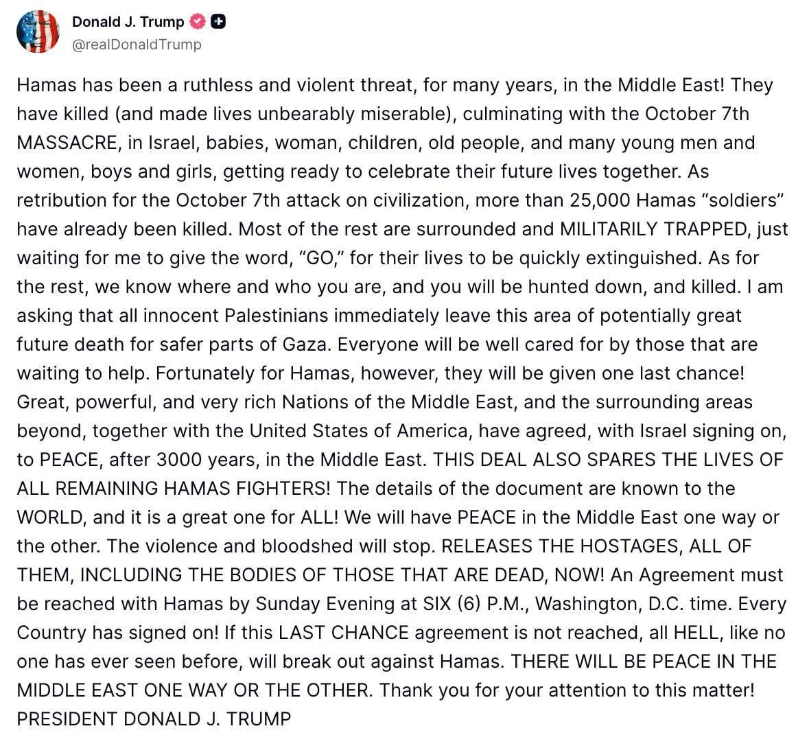 Я призываю всех невинных палестинцев немедленно покинуть эту зону потенциальной массовой гибели и переместиться в более безопасные районы Газы. Все будут хорошо обеспечены заботой тех, кто ждёт, чтобы помочь. Однако, к счастью для ХАМАСа, им будет предоставлен последний шанс! Великие, могущественные и очень богатые нации Ближнего Востока и прилегающих регионов вместе с Соединёнными Штатами Америки договорились, при участии Израиля, о МИРЕ после 3000 лет на Ближнем Востоке. ЭТА СДЕЛКА ТАКЖЕ СОХРАНЯЕТ ЖИЗНИ ВСЕМ ОСТАВШИМСЯ БОЙЦАМ ХАМАСА! Детали документа известны МИРУ, и это великая сделка для ВСЕХ! У нас будет МИР на Ближнем Востоке так или иначе. Насилие и кровопролитие прекратятся. ОСВОБОДИТЕ ЗАЛОЖНИКОВ, ВСЕХ, ВКЛЮЧАЯ ТЕЛА ПОГИБШИХ, НЕМЕДЛЕННО! Соглашение должно быть достигнуто с ХАМАСом до воскресного вечера в ШЕСТЬ (6) часов по времени Вашингтона. Каждая страна подписала соглашение!