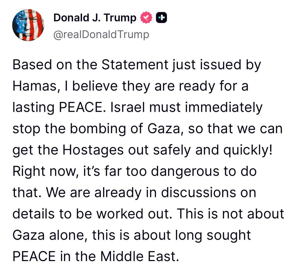 «Основываясь на заявлении, опубликованном ХАМАС, я считаю, что они готовы к прочному МИРУ. Израиль должен немедленно прекратить бомбардировки Газы, чтобы мы могли безопасно и быстро вывести заложников! Сейчас это слишком опасно. Мы уже ведем переговоры по деталям, которые нужно проработать. Речь идет не только о Газе, а о давно желанном МИРЕ на Ближнем Востоке», — написал он в сети