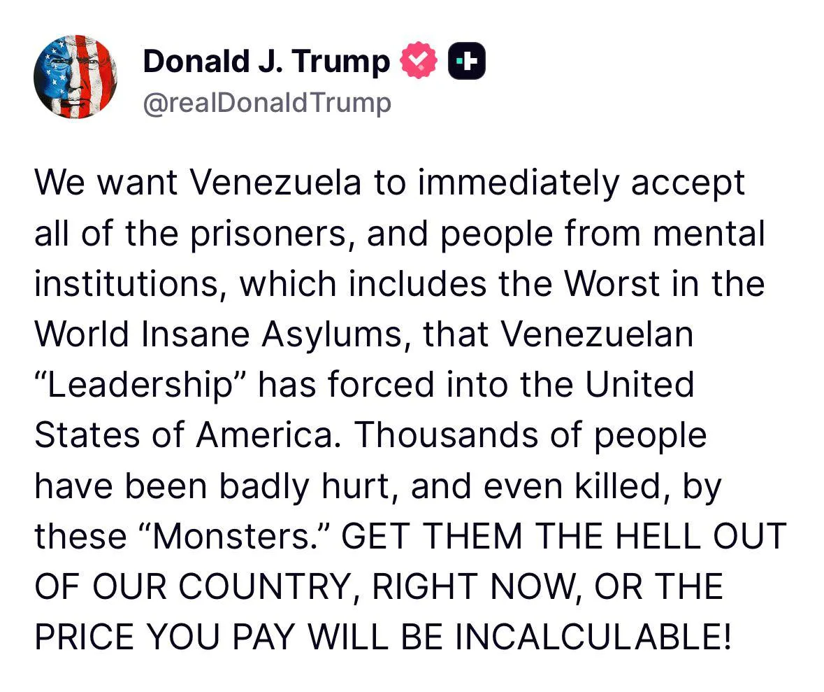 Дональд Трамп в своём посте в Truth Social потребовал от Каракаса немедленно принять обратно «заключённых и людей из психиатрических учреждений». По его словам, власти Венесуэлы насильно отправили их в США.