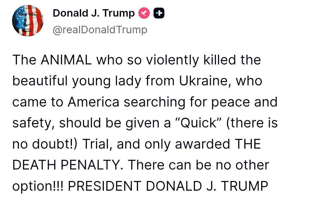 «Животное, которое так жестоко убило прекрасную молодую девушку из Украины, приехавшую в Америку в поисках мира и безопасности, должно быть подвергнуто «быстрому» (в этом нет сомнений!) суду и приговорено только к смертной казни», — написал президент США.