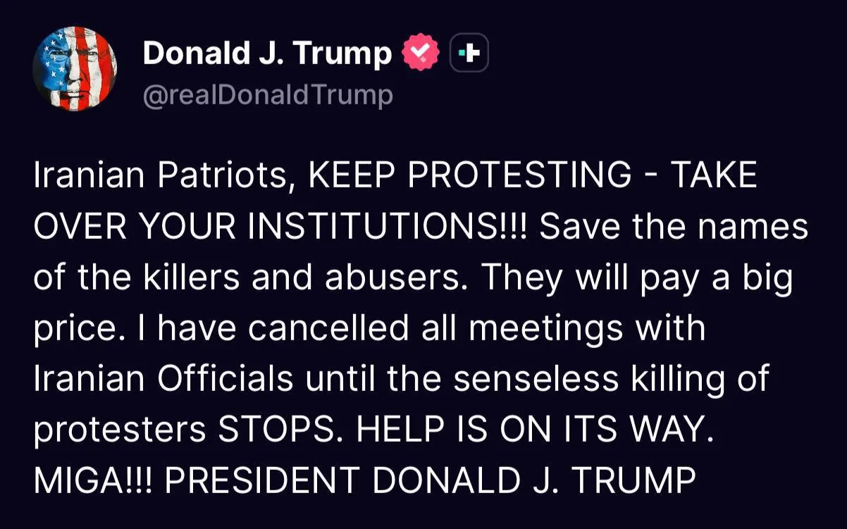Я отменил все встречи с иранскими официальными лицами до тех пор, пока бессмысленные убийства протестующих НЕ ПРЕКРАТЯТСЯ.