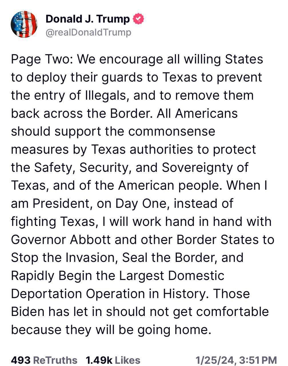 «Мы призываем все желающие штаты направить своих охранников в Техас, чтобы предотвратить въезд нелегалов, и выдворить их обратно через границу. Все американцы должны поддержать разумные меры властей Техаса по защите безопасности и суверенитета Техаса и американского народа», – сказал Дональд Трамп.