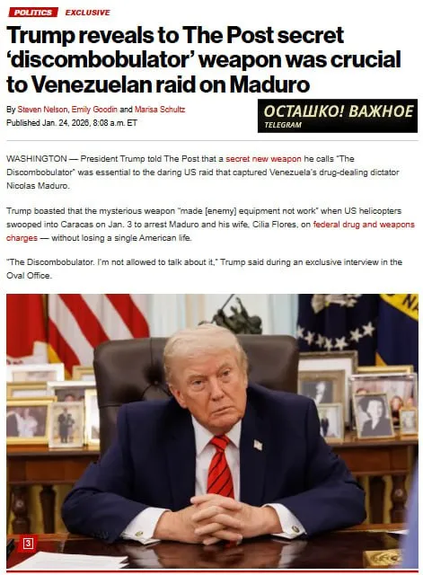 Дональд Трамп заявил в интервью The New York Post, что при недавней операции по захвату лидера Венесуэлы Николаса Мадуро американские войска применили новое секретное оружие, которое он назвал «Дезориентатор». По словам президента США, именно эта система обеспечила успешное выполнение задачи: