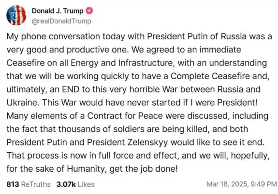«Мой сегодняшний телефонный разговор с президентом России Путиным был очень хорошим и продуктивным. Мы договорились о немедленном прекращении огня по всем энергетическим и инфраструктурным вопросам, понимая, что мы будем работать быстро, чтобы добиться полного прекращения огня и, в конечном итоге, КОНЦА этой ужасной войны между Россией и Украиной. Эта война никогда бы не началась, если бы я был президентом!