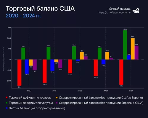 Действительно, Трамп упирает на то, что Европа «наживается» на США, но так ли это? Да, в 2024 году США отдали Европе на 235,6 млрд долларов больше, чем получили от неё. И вообще за последние пять лет по торговле товарами у США с Европой складывается дефицит. На это всё упирает Трамп, размахивая тарифной дубиной.