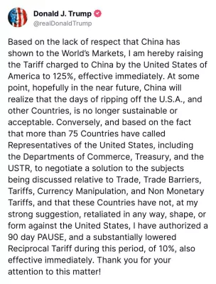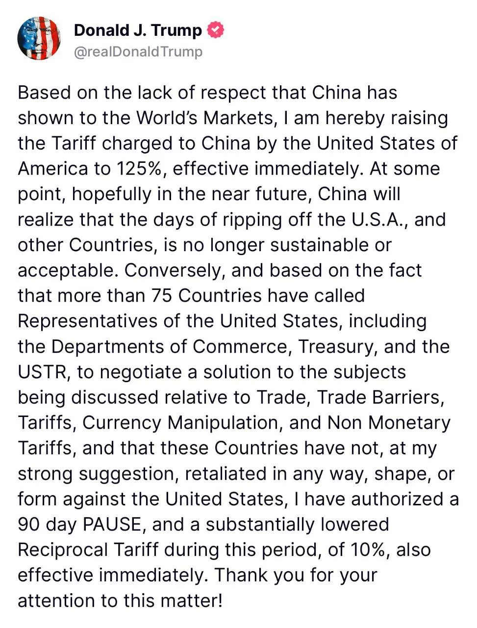 Правда, китайцев это не коснулось. За «неуважение к мировым рынкам» Трамп наказал их 125% пошлинами. Два дня назад они составляли 104%. Фондовые рынки уже затрясло от новостей.