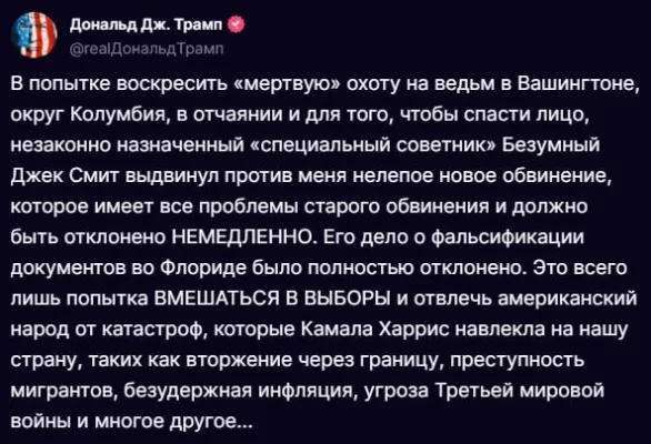Республиканец в своей соцсети Truth Social назвал спецпрокурора США Смита «безумным» и потребовал снять с него обвинения.