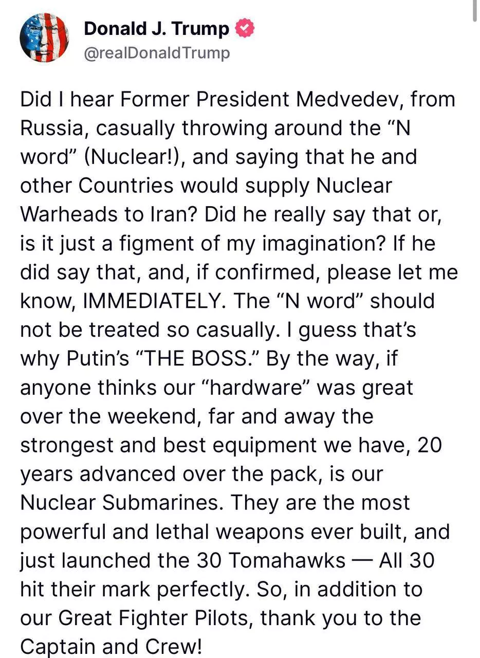 Президент США написал в Truth Social пост в ответ на заявление зампреда Совбеза России о совершённой Вашингтоном ошибке при атаке на Иран.