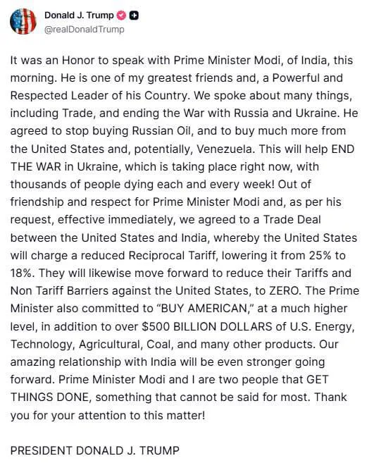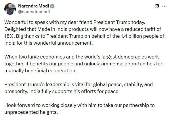 «Было замечательно сегодня поговорить с моим дорогим другом, президентом Трампом. Я рад, что на товары, произведенные в Индии, теперь будет действовать сниженная таможенная пошлина в размере 18%. Огромное спасибо президенту Трампу от имени 1,4 миллиарда жителей Индии за это замечательное объявление»