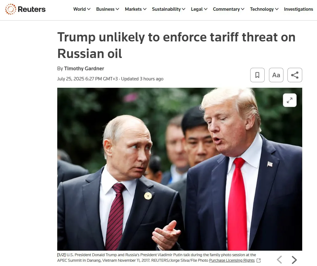 Президент США пригрозил ввести 100% тарифы для стран, покупающих российскую нефть, если Москва не согласится на мир с Украиной за 50 дней. Однако эксперты считают, что до этого не дойдёт — резкое сокращение поставок вызвало бы скачок цен на нефть и удар по мировой экономике, — сообщает Reuters.