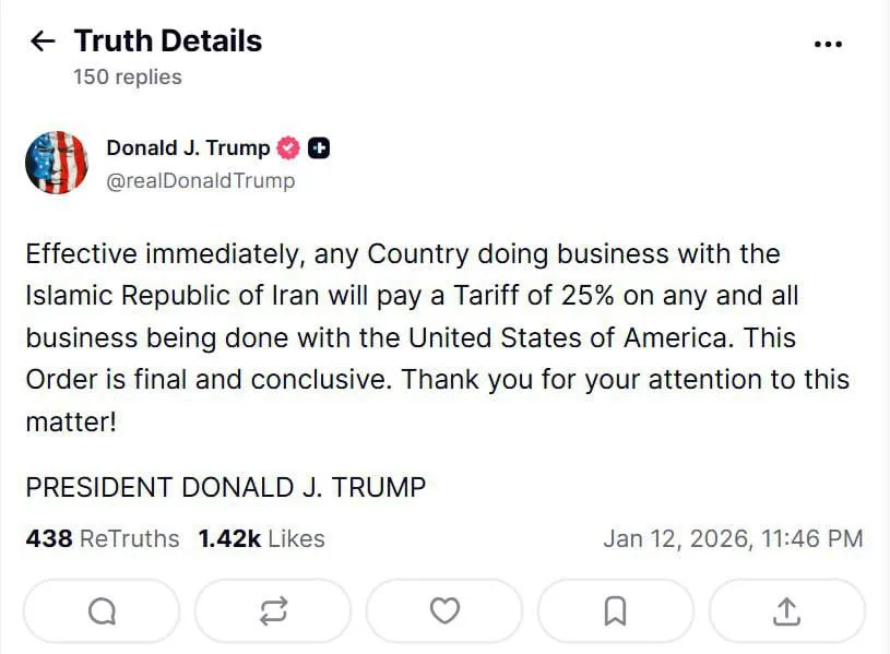 «С этого момента любая страна, ведущая бизнес с Исламской Республикой Иран, будет платить 25% пошлины на любые торговые операции с Соединенными Штатами Америки. Это распоряжение является окончательным и не подлежит пересмотру», – сообщил президент США.