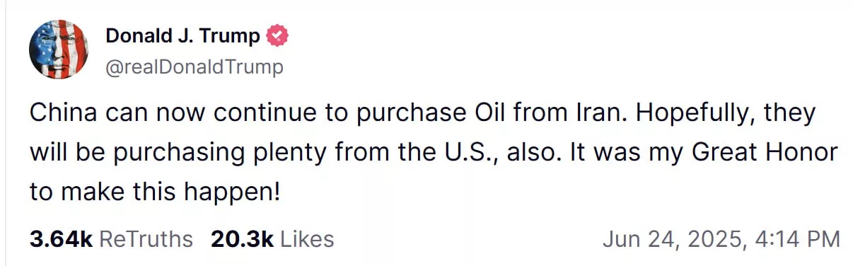 «Китай теперь может продолжать покупать нефть у Ирана [прим. Кримсон: раньше Трамп угрожал и вводил санкции против КНР за это]. Надеюсь, они также будут много покупать у США. Для меня было большой честью сделать так, чтобы это произошло!»